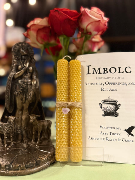 Each Imbolc Sabbat box will be neatly packed with a Asheville Raven and Crone Imbolc Zine, Brigid's Cross, and Amethyst Stone.